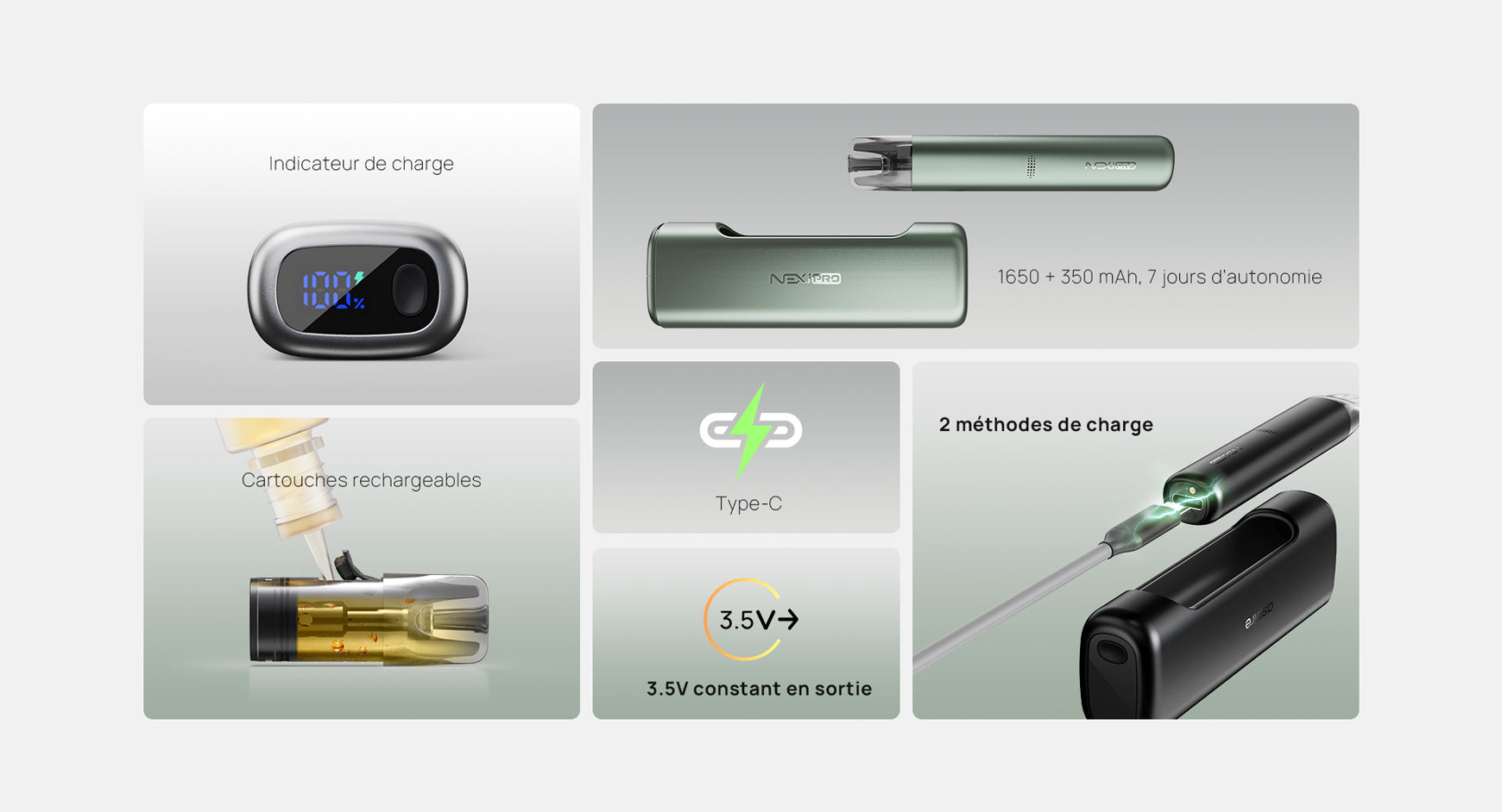 Élancé et discret, ce pod Nexi pro au format nomade se glisse aisément dans une poche ou un sac. Son utilisation est d’une simplicité remarquable : grâce à la fonction auto draw, une simple aspiration suffit pour déclencher la chauffe. Aspire accompagne son pod d’un power bank de 1650 mAh qui vient se fixer magnétiquement à l’appareil. Ce dernier permet de recharger le pod, doté d’une batterie de 350 mAh, jusqu’à six fois ! L’ensemble garantit une autonomie exceptionnelle, idéale pour les vapoteurs en déplacement.